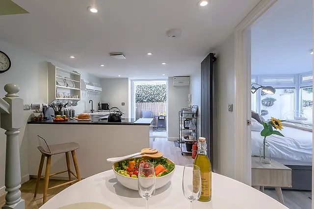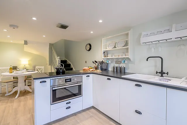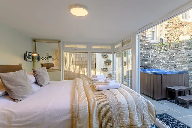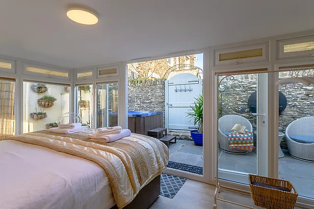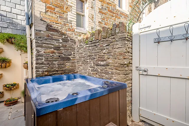 The downstairs bedroom opens onto a private courtyard, featuring a luxurious hot tub, where you can unwind under the stars. The cottage boasts a well-equipped kitchen with modern amenities, ensuring a seamless stay.
