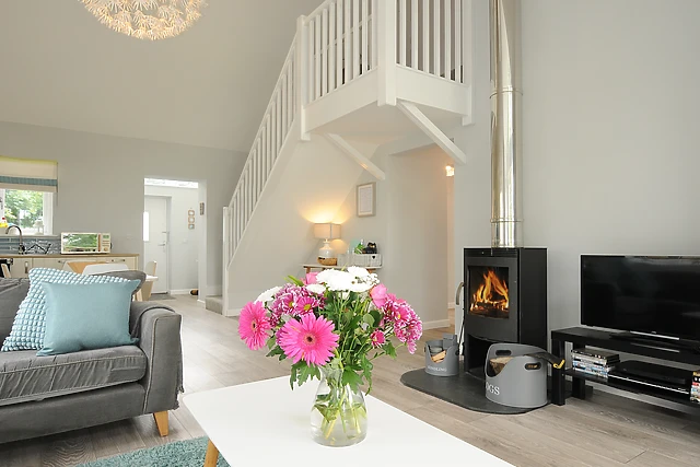 Be welcomed into a tasteful, light and airy open-plan living space with a contemporary feel, offering a great selection of amenities and a dining space where guests can enjoy a hearty meal together. Here there is also a plush seating area with a welcoming woodburning stove, ideal for warming your feet on as you recline after a long day of walking.
