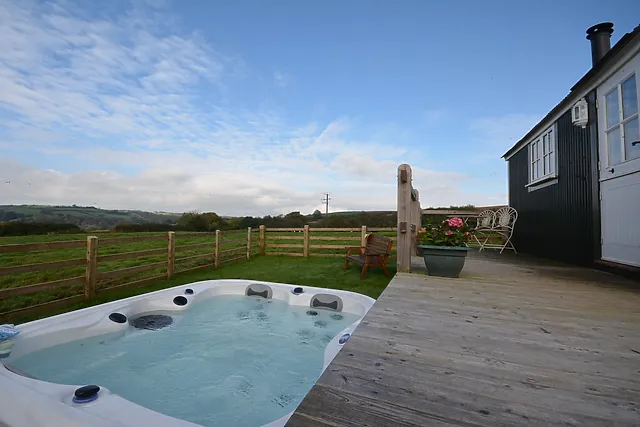 Escape to the Shepherds Hut At Uplowman, a bespoke sanctuary nestled in the Devon countryside. This luxurious shepherd's hut sleeps two, offering a romantic retreat complete with a private hot tub for ultimate relaxation.