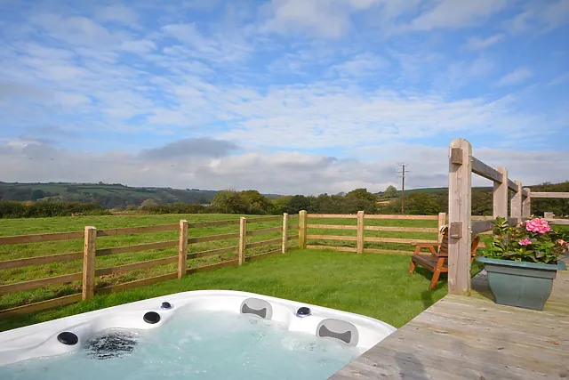 Yes, the accommodation features a private hot tub on an enclosed decked area, offering guests a luxurious spot to relax and enjoy the stunning countryside views.