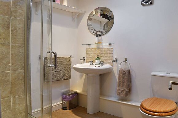 The shower room has a corner cubicle.