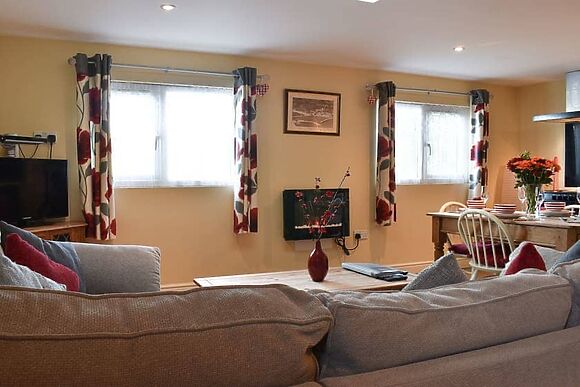 A large corner sofa, 43" TV, PlayStation 3 and pine dining table make the open-plan living space genuinely comfortable and sociable.