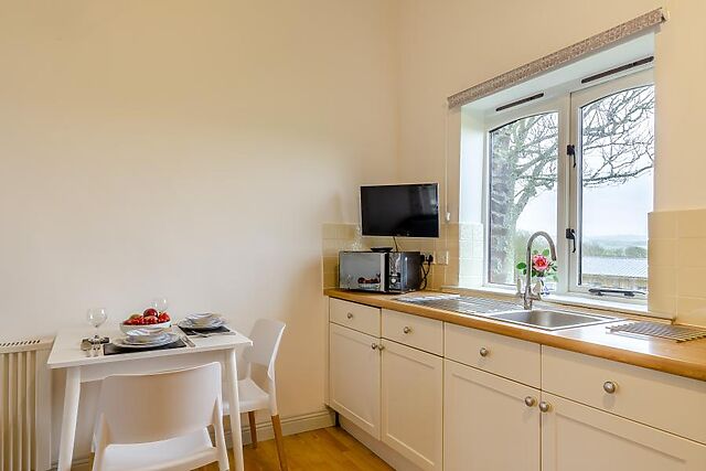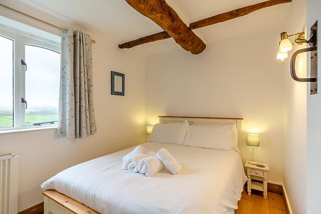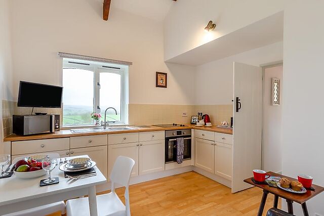 The accommodation is all on one level and is thoughtfully laid out for a relaxing stay. A small entrance hall leads into the open-plan kitchen and living area, where exposed beams and countryside views add character and charm.