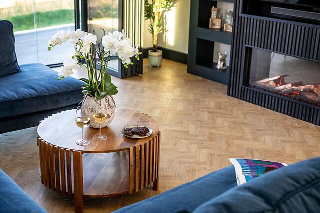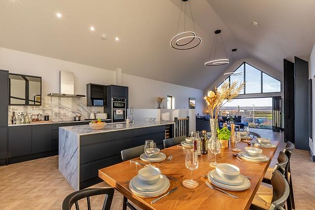 Upstairs, the open-plan lounge/kitchen/diner combines stylish design with extra special homely touches; warm chilly toes beside the flame effect log fire or throw open the large picture window to the glass Juliette balcony to enjoy breathtaking views as you unwind. The enclosed garden is a haven of tranquillity; dine alfresco on the raised deck, wash sandy toes in the hot outdoor shower on the lower patio, play garden games on the lawn, relax in the hot tub or let off some steam in the games room.