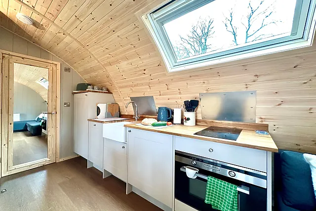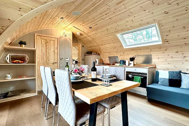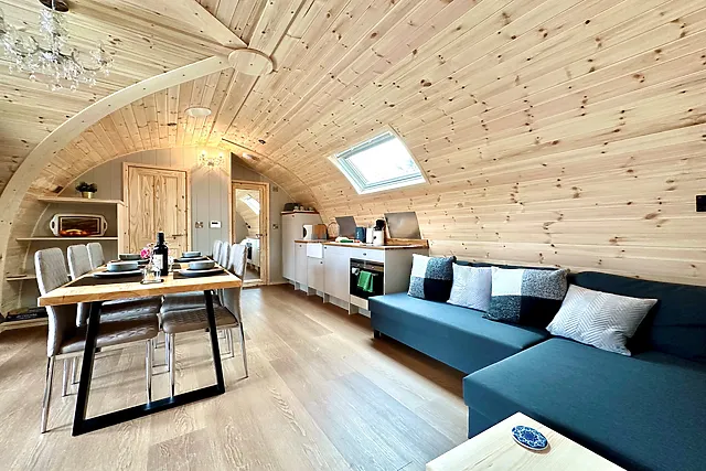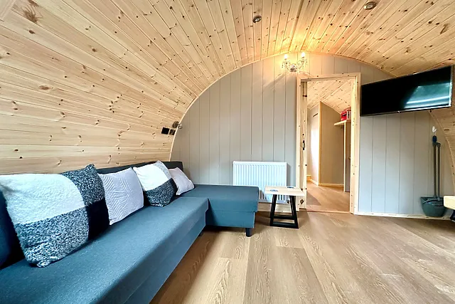 - Open-plan living area with a Smart TV and cosy seating, perfect for unwinding. - Large window with woodland views enhances the inviting atmosphere.