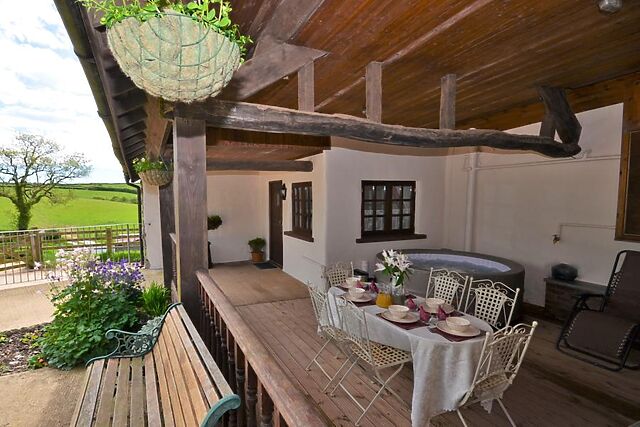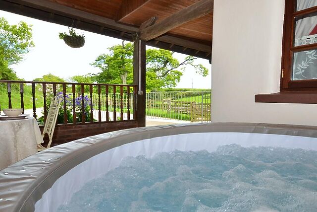 Yes, the accommodation boasts a fantastic private hot tub on a covered, decked terrace, offering guests a luxurious space to relax and enjoy the countryside views.