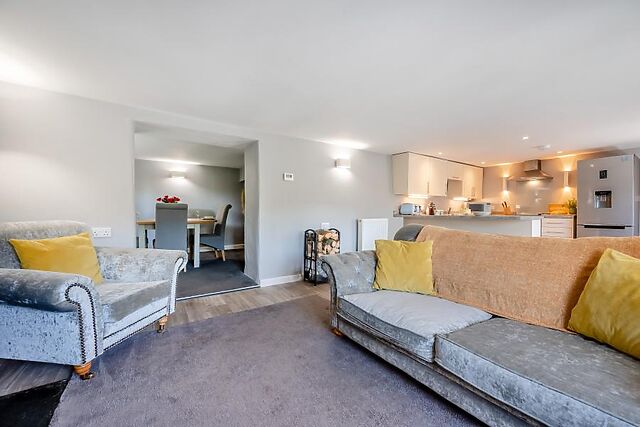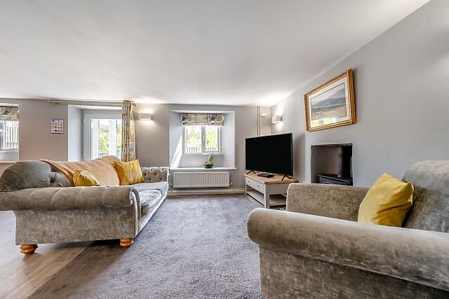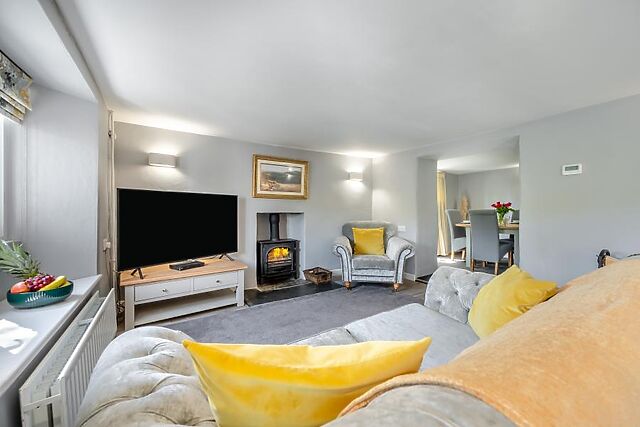 A doorway then leads through to a pretty dining room, and then on through to an elegant, fully equipped kitchen with a useful breakfast bar. Upstairs, you will find a sleek and invigorating bathroom and two beautiful bedrooms, each with characterful beamed ceilings: there’s a light and airy king-size room and a charming twin.