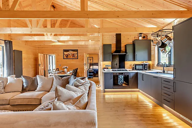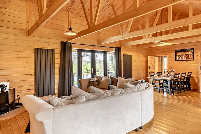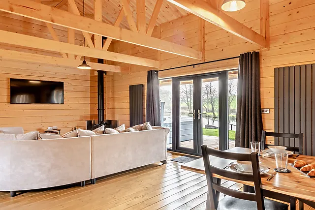 Living space - Open-plan lounge, dining, and kitchen area with views of the lake. - Cosy lounge with a wood burner, Smart TV, and plenty of seating.
