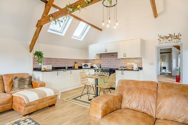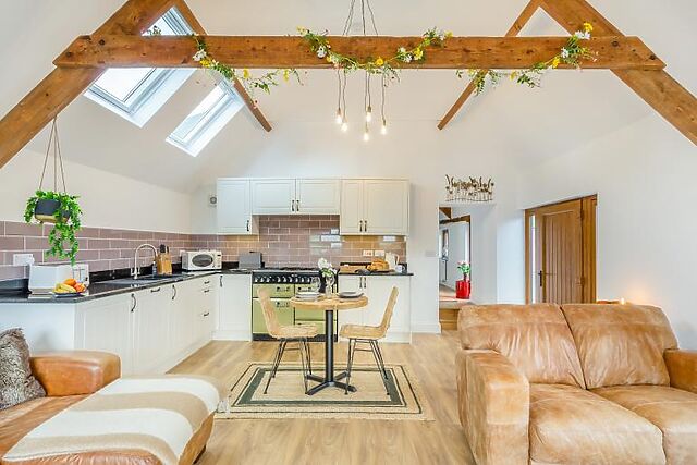 Step inside to find a light and airy open-plan lounge, kitchen, and dining area, complete with exposed beams and contemporary furnishings. The cosy corner sofa and Smart TV provide a perfect spot to unwind after a day of exploring.