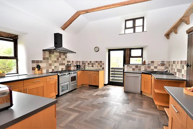 With flagged floors and cream walls complemented by high ceilings and exposed beams, this detached barn conversion is bursting with warmth and character. Open the French doors to the garden from the lounge/diner and enjoy home-cooked meals with the fresh air breezing in.