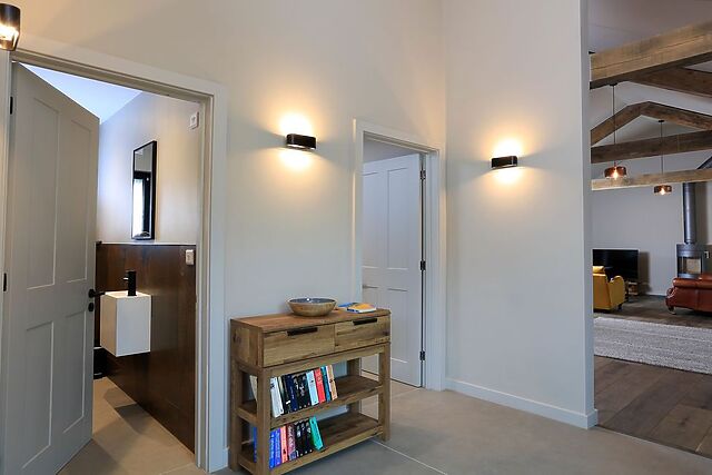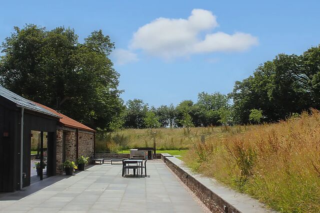 The Barns at Downton is a stunning three-bedroom Eco-friendly barn conversion located in the hamlet of Downton just outside the beautiful riverside village of Dittisham near Dartmouth and is a wonderful place for a family of six to stay while exploring the surrounding area including the immediately adjacent South Devon AONB. The property is approached via a gated entry to a car park with electric charging point with stone steps leading down to a spacious private terrace with ample seating and wood fired hot tub.