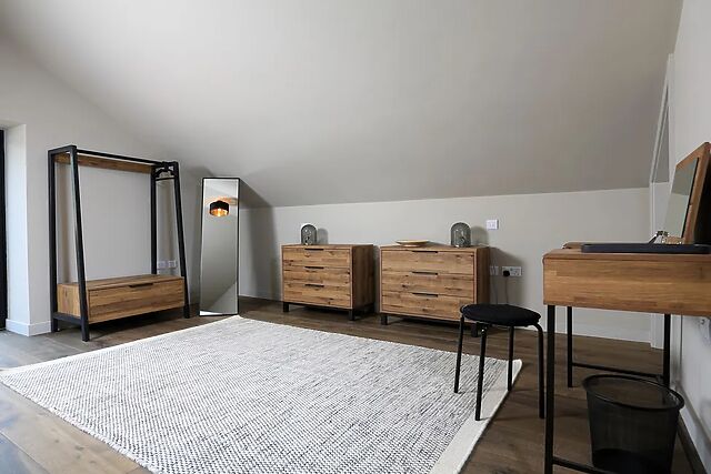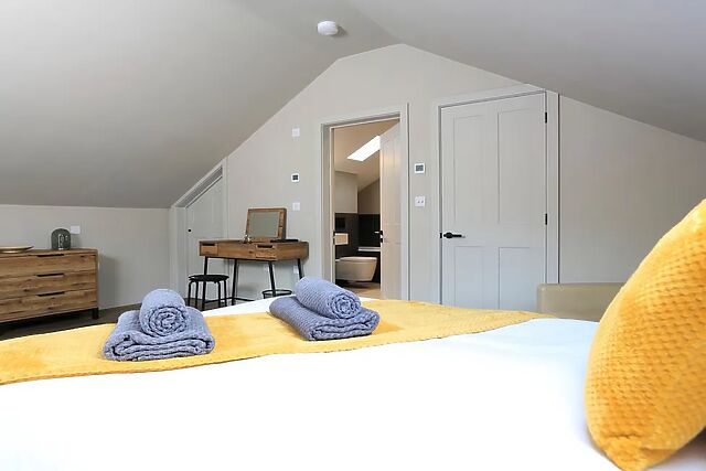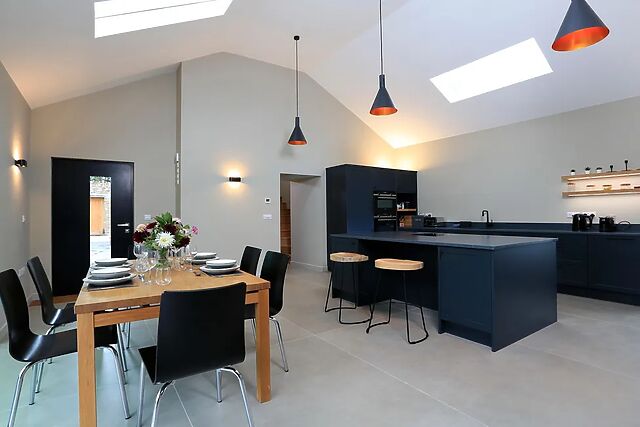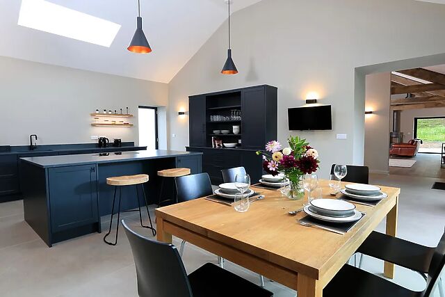 Behind this are two large lounging chairs to enjoy a relaxing drink or read a book plus there is a desk, with wired internet connection, for anyone who needs to just check in with work while away. To the left of the entrance hall is a large kitchen/diner with high ceilings, dining table, breakfast bar and island.