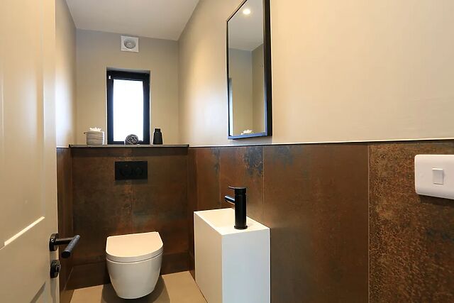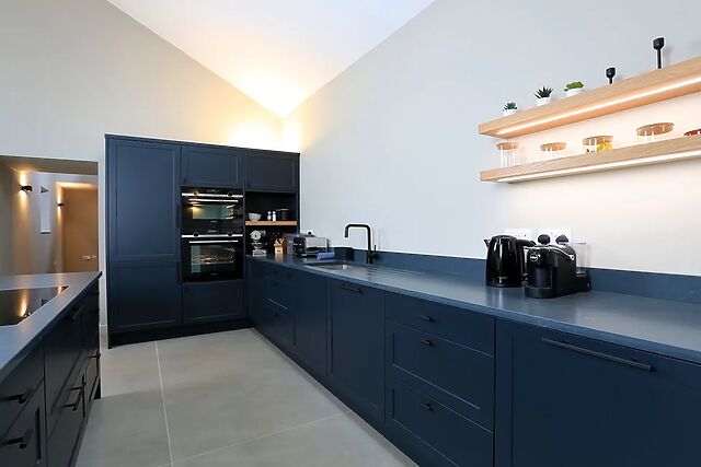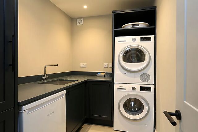 There are double ovens with microwave, induction hob, fridge freezer and dishwasher as well as a Lavazza coffee machine. From the kitchen the sliding glass doors take you to the private patio with dining table, BBQ, garden lounging set and wood fired hot tub.