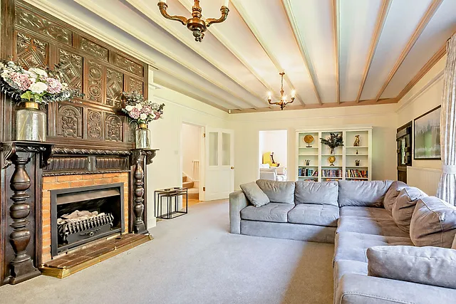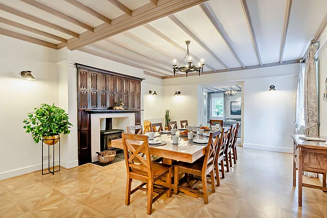 Inside, the cottage exudes charm with its grand dining room featuring a wood burner, a snooker room, and a lounge with an ornamental fireplace.