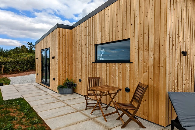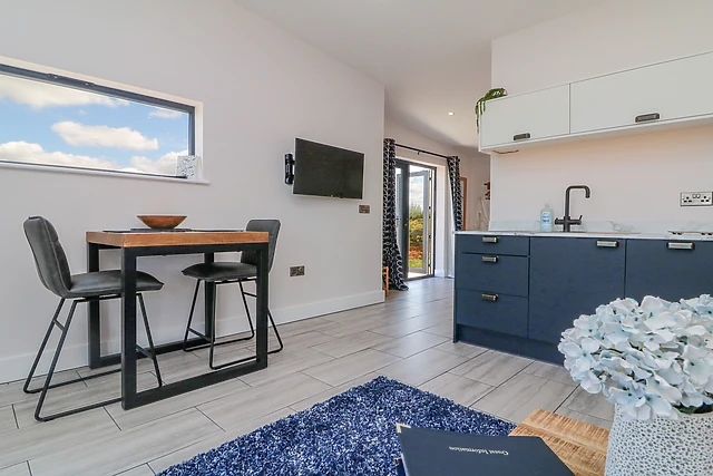 Accommodating two guests in a cosy, studio-style layout, the lodge boasts a sumptuous double bed, a sleek kitchen, and a dining area for intimate meals.