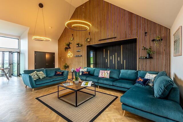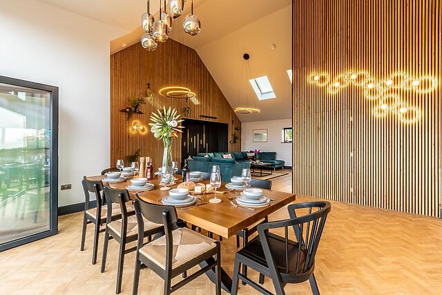 The ground floor also contains a Scandi-style family bathroom with a freestanding bath, and four boutique-style bedrooms – two zip-and-link twin rooms, an en-suite king-size and a super-king-size. Climb the stairs to reach the hub of the home with high ceilings, natural light pouring in through the wide Juliet balcony doors and a rustic-chic feel throughout the neutral-toned and wooden decor.