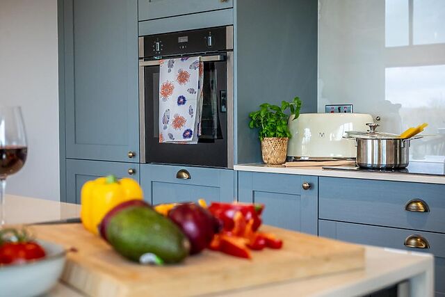 The wooden dining table benefits from balcony-side views of the sea which sits between the plush velvet sofas of the lounge area and a contemporary white and blue fitted kitchen. Here, you’ll find a breakfast bar on the large kitchen island.