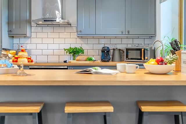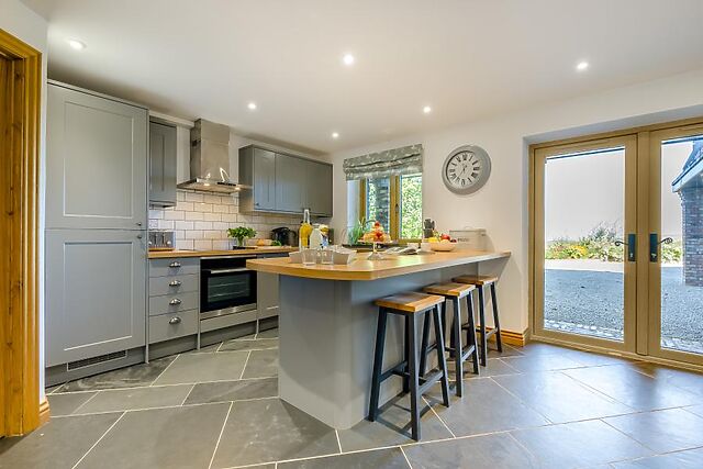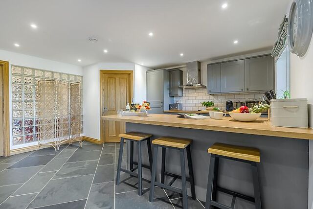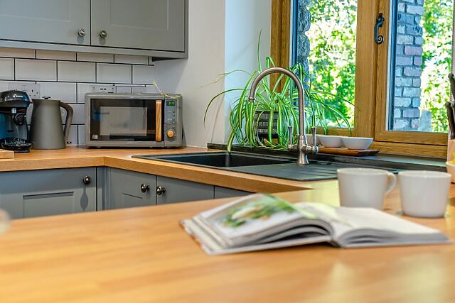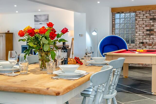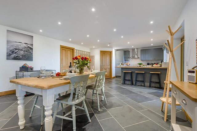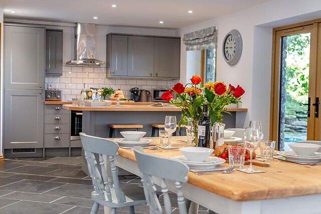Cook up a storm for breakfast and dinner or prepare picnics in the lovely, stylish kitchen which has a handy breakfast bar so you can socialise together as the chef cooks. A country style dining table provides a space where you can eat together or play a board game.