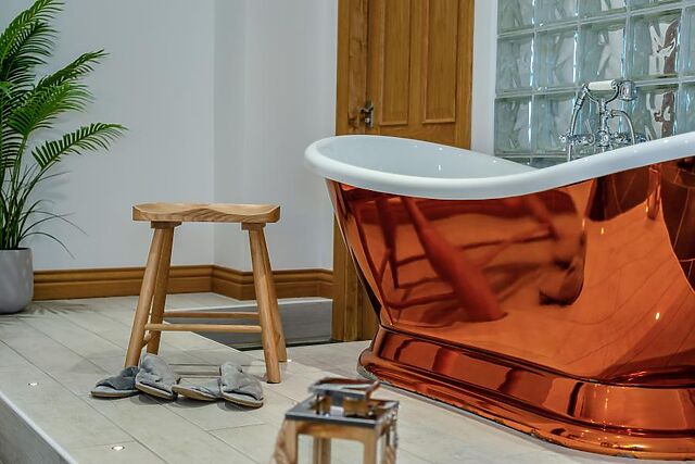 The sumptuous master bedroom contains a king-size bed and boasts a beautiful free-standing copper bath where you can soak away the day. The other bedroom has twin zip-and-link beds.