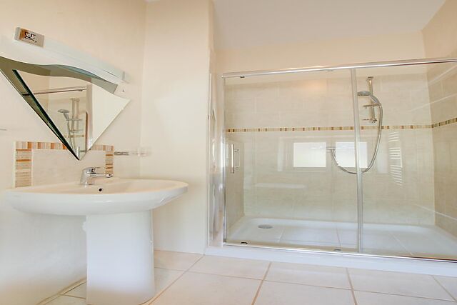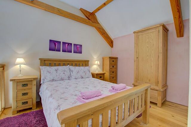 Upstairs, the mezzanine double bedroom features wooden beamed ceilings and a gleaming en-suite shower room, providing a tranquil space to unwind.