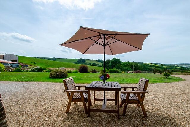 Upstairs, the mezzanine double bedroom features wooden beamed ceilings and a gleaming en-suite shower room, providing a tranquil space to unwind. Outside, you have your own allocated area of open garden with a table, chairs, and a parasol, perfect for al fresco dining.