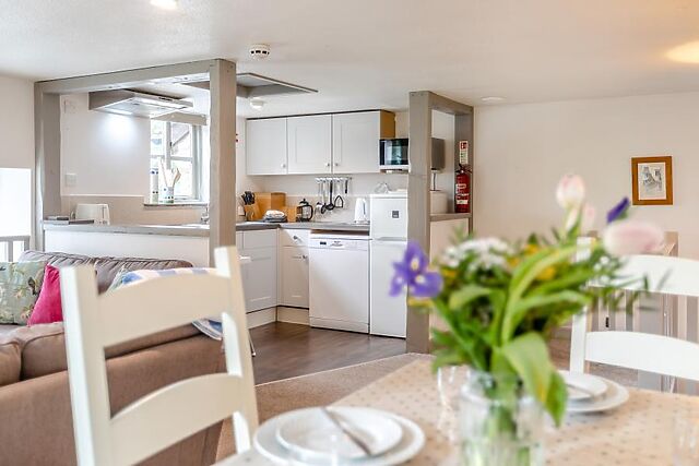 In one corner is a sleek kitchen area with all the equipment needed to cater for the group, and nestled under the window is a cute dining table for enjoying mealtimes together. After dinner, retire to the plump sofas in the lounge area to watch a movie on the Smart TV.