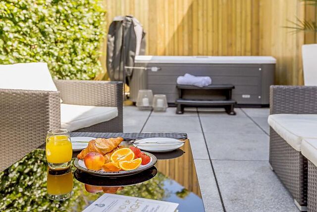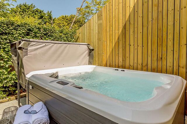 Yes, the accommodation features a hot tub in the enclosed courtyard garden, providing an inviting experience especially at night under the clear skies.