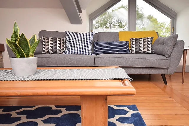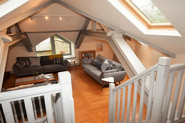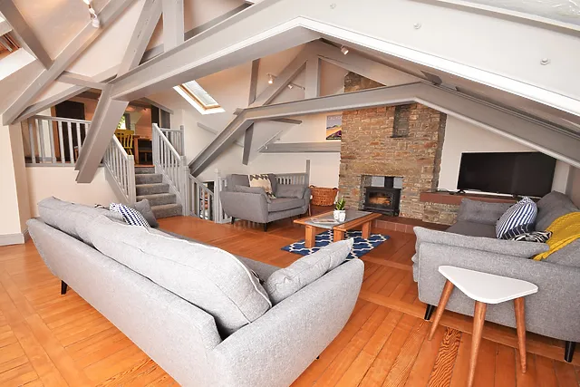 The ground floor layout leads to a secluded patio, perfect for morning coffee. The heart of the home is the spacious lounge with vaulted ceilings and a cosy woodburner, ideal for relaxing evenings.
