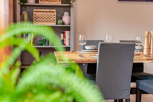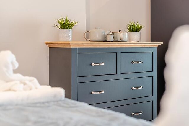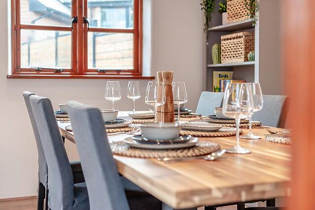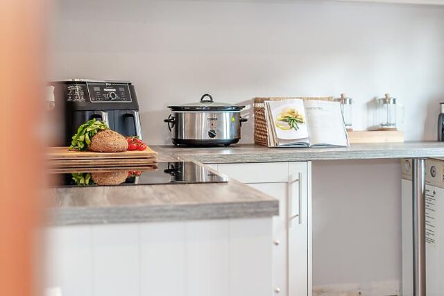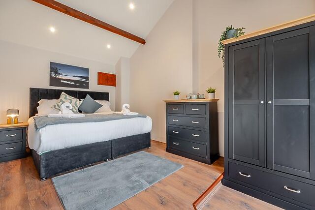 The lounge/diner, complete with a wood burner, sets the tone for cosy evenings in. The kitchen features modern appliances that make light work of mealtimes, and guests can dine in or out with an indoor dining table and an outdoor table on the rear patio.