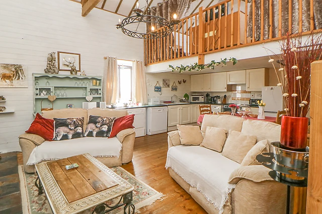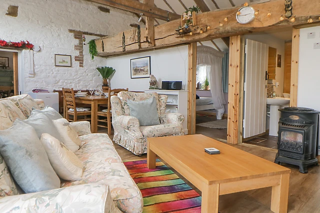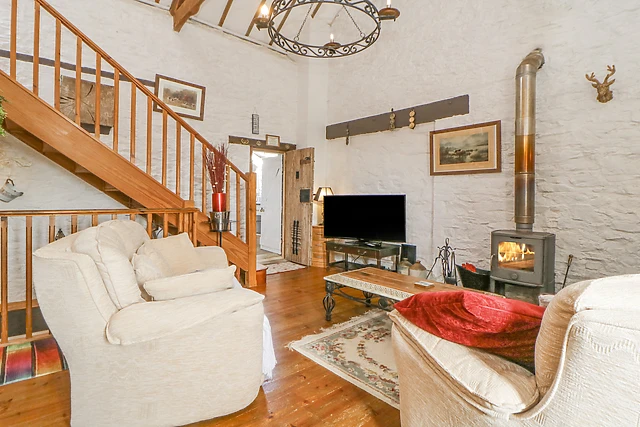 Four-poster bedroom and a bathroom with corner whirlpool bath, separate shower, whb and wc, as well as a comfortable sitting area with warming woodburning stove. Finally, on the second floor is a lovely mezzanine double bedroom.