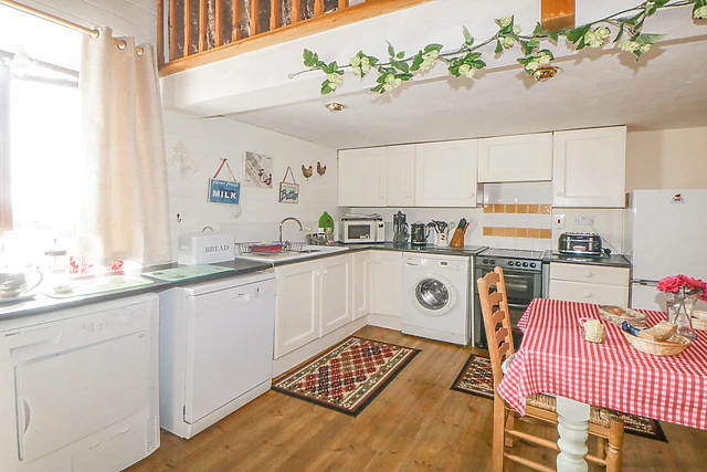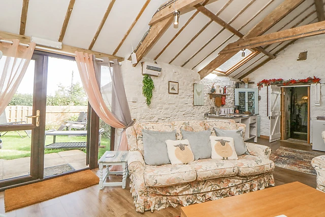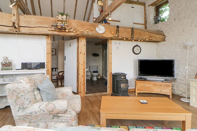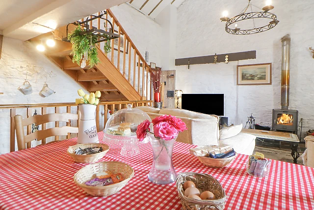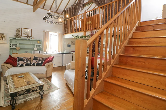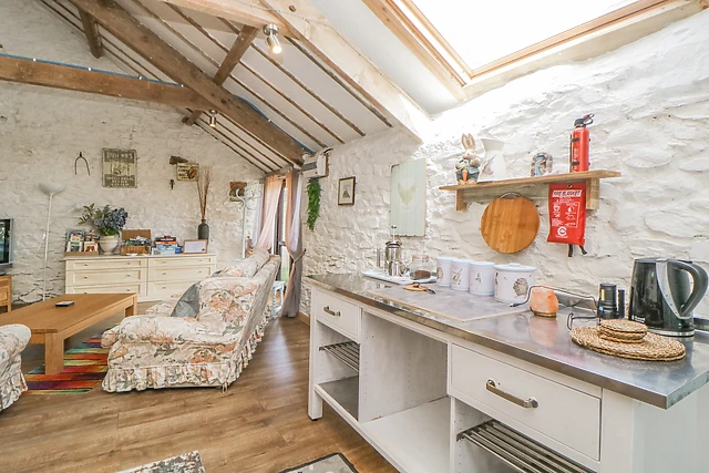 On the ground floor you will find a comfortable and stylish king-size bedroom, a bathroom and a cloakroom with a basin and WC. A set of wooden stairs lead you to a quirky and characterful open plan living area, with vaulted beamed ceiling and exposed white stone wall, and includes a well-equipped kitchen, from the existing kitchen area a door leads to a further open plan kitchenette, dining and sitting room with door to a small enclosed garden with seating.