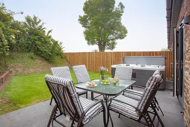Outside, the garden features a lawn, patio with dining furniture, and a hot tub for six.