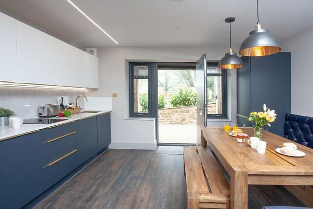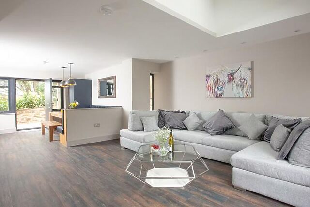 Step inside to find a bright, open-plan living area with dark-wood floors and underfloor heating.