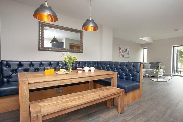 Step inside to find a bright, open-plan living area with dark-wood floors and underfloor heating. The sleek kitchen is fully equipped, and the dining area is perfect for sharing meals and stories. Relax on the large U-shaped corner sofa and enjoy a movie on the Smart TV.