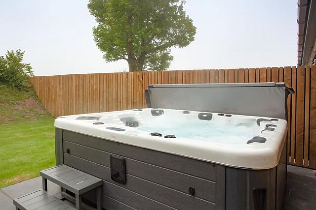 Outside, the garden features a lawn, patio with dining furniture, and a hot tub for six. It's the perfect spot to unwind under the stars.
