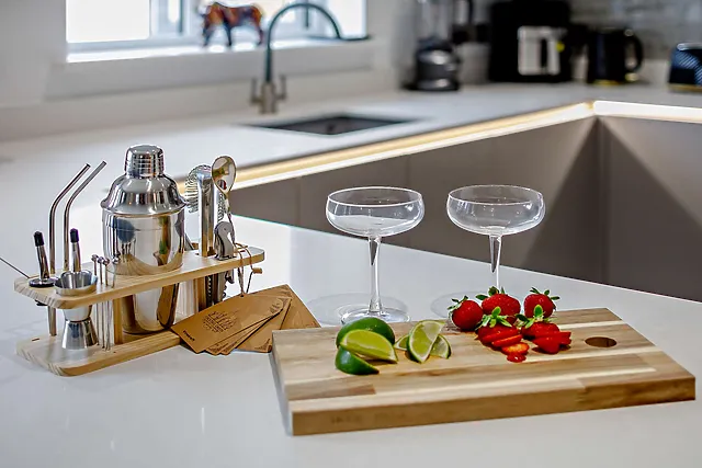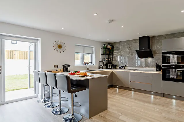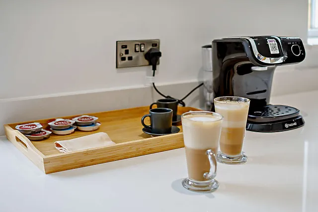 Inside, the open-plan living area exudes contemporary elegance, complete with a Smart TV and a selection of board games for cosy evenings in. The kitchen is fully equipped, featuring a coffee machine and a utility area with laundry facilities.