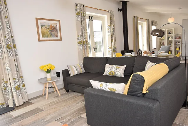 The open-plan lounge, kitchen, and diner create a homely atmosphere, complete with a wood burner and colour-changing mood lighting for cosy evenings in.