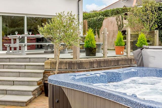 Yes, guests can luxuriate in a large hot tub located on the split-level patio, perfect for relaxation and enjoyment during their stay.