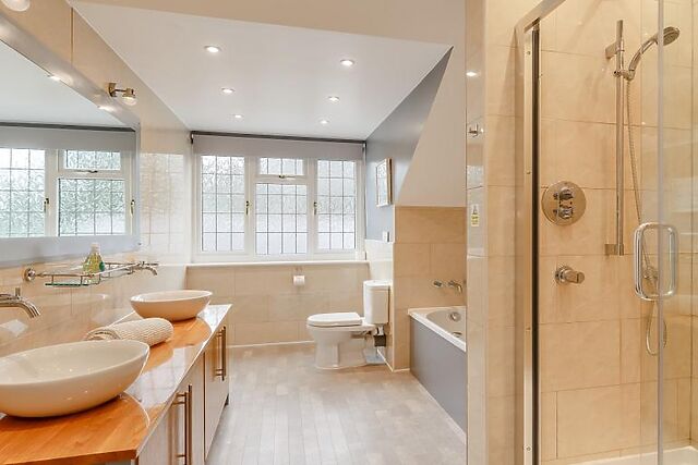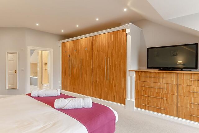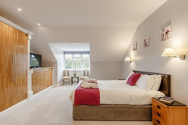 The master bedroom features a super-king-size bed and an en-suite with a bath and a separate power shower, providing a haven of relaxation.