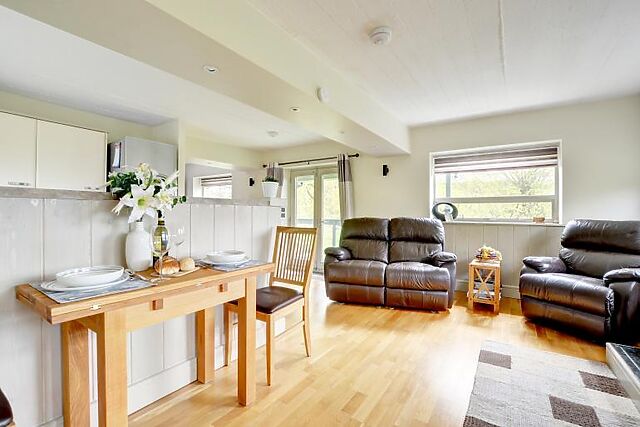 Inside, the open-plan lounge/kitchen/diner/bedroom is bright and airy, with triple-aspect windows offering stunning views of the surrounding countryside. The wood burner adds a touch of warmth and cosiness, making it an ideal spot to relax with a classic film on the TV/DVD.