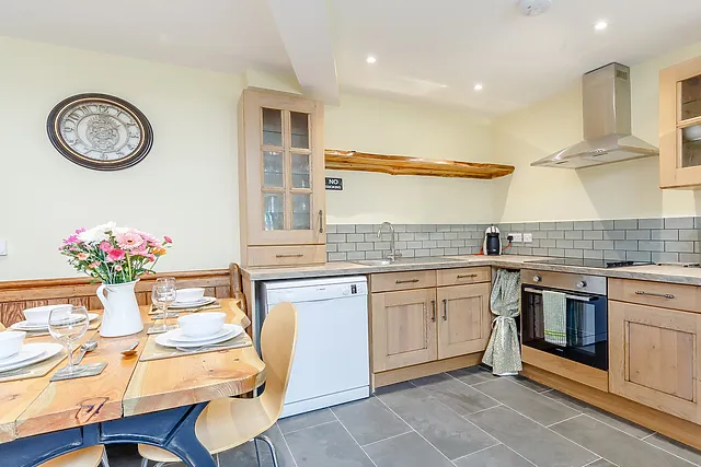 The open-plan living area, complete with a wood burner, offers a cosy retreat, while the country-style kitchen is perfect for culinary exploits.