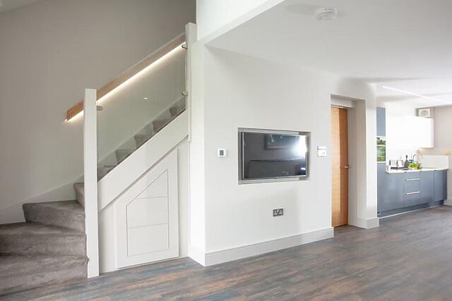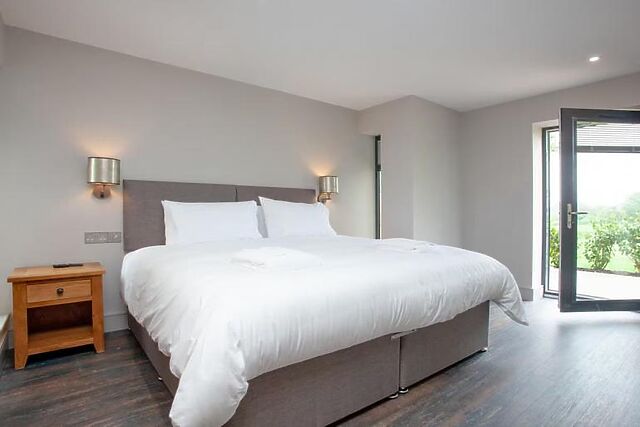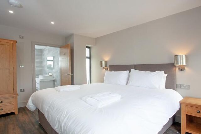 After dinner, relax on the comfortable sofa and watch your favourite show on the Smart TV. The ground floor features one of the three super king-size bedrooms with an en-suite bathroom and direct access to the patio.
