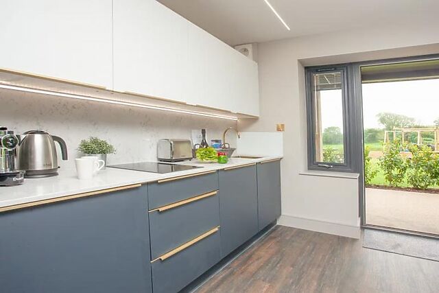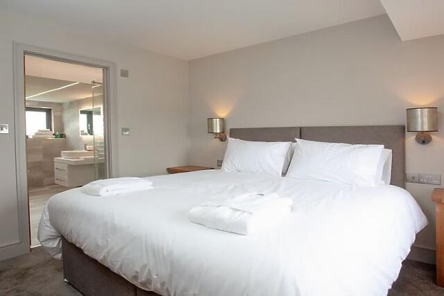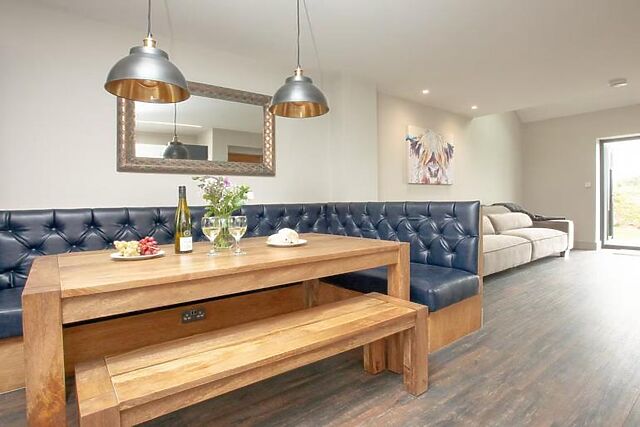 Step into the light-filled, open-plan living space where you can prepare meals in the well-equipped kitchen and enjoy them in the adjacent dining area. After dinner, relax on the comfortable sofa and watch your favourite show on the Smart TV. The ground floor features one of the three super king-size bedrooms with an en-suite bathroom and direct access to the patio.