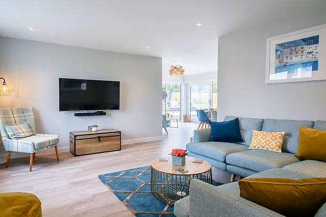 The property boasts four well-appointed bedrooms, including two super-king-size, one king-size, and a room with a single and cabin bed suitable for children. With two bathrooms and a separate WC, comfort is guaranteed for all guests. The open-plan lounge, kitchen, and diner, complete with modern appliances and a breakfast bar, provide the perfect setting for social gatherings.