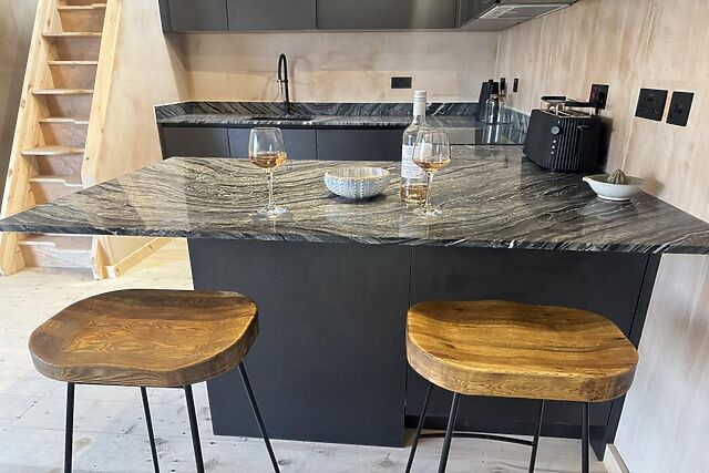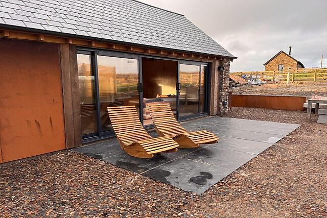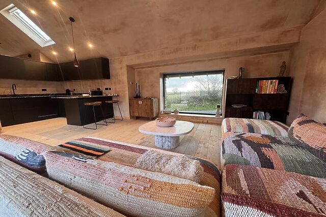 The open-plan living, comprising lounge, kitchen and dining area, feels bright and sociable to spend time in. There is a breakfast bar with stools, comfortable sofas, a Smart TV and a large window so you can absorb the countryside vistas and sea views beyond.