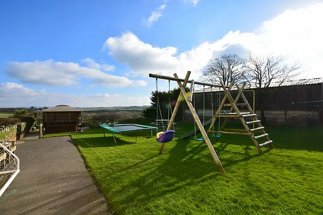 Indeed, the property offers a range of child-friendly facilities including a play area with a trampoline, swings, and a slide, as well as a cot and highchair for the little ones.
