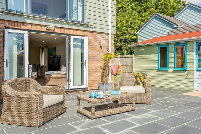 Guests can enjoy a level gated garden, a garden bar with a changing room, a gas BBQ, and an outdoor rain shower, ideal for freshening up after a day at the beach.