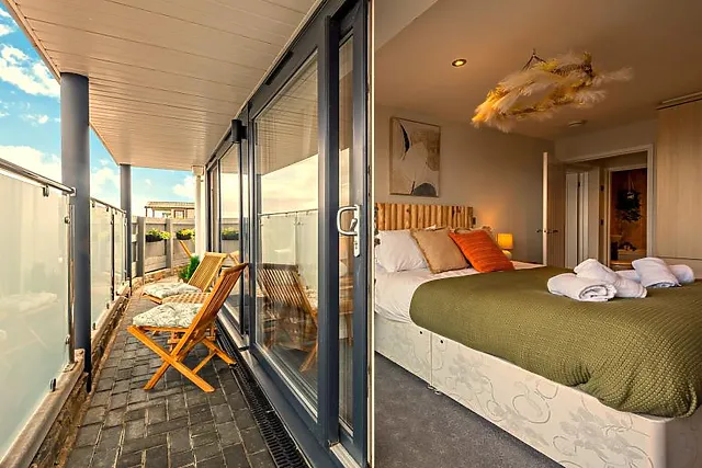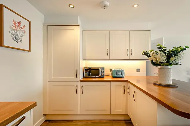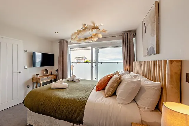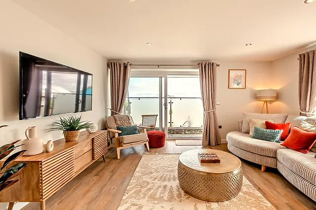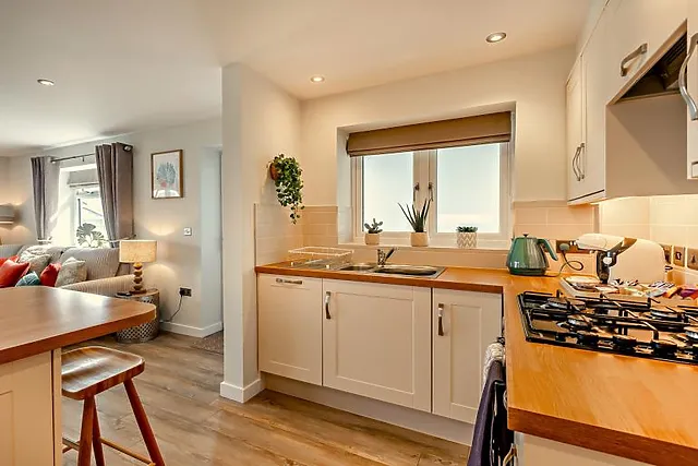 Step into this apartment to find yourself in the open-plan living space with a lounge/kitchen/diner, complete with French doors for letting the sea air in and offering access to the side terrace. With a handy breakfast bar and comfy seating set opposite a Smart TV, you’ve everything you need for evenings of relaxation here.