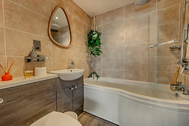 A king-size and a twin, each with their own Smart TV, offer a restful space to end each day. There are two bathrooms, one en-suite and one separate family bathroom, adding convenience and privacy for all four guests.