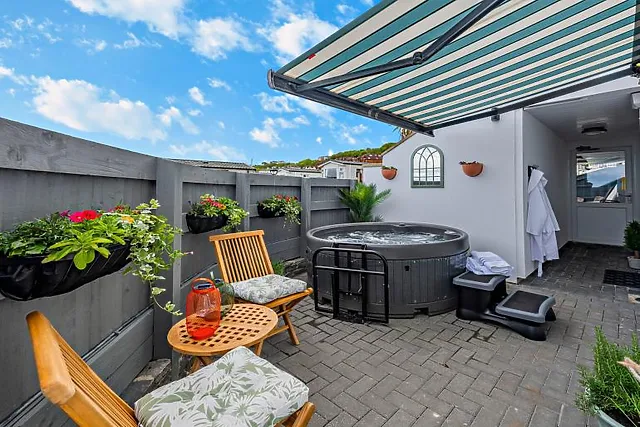 When the sun shines, move into the rear terrace to find plenty more outdoor seating and the hot tub. Back indoors, find two bedrooms here on the ground floor.